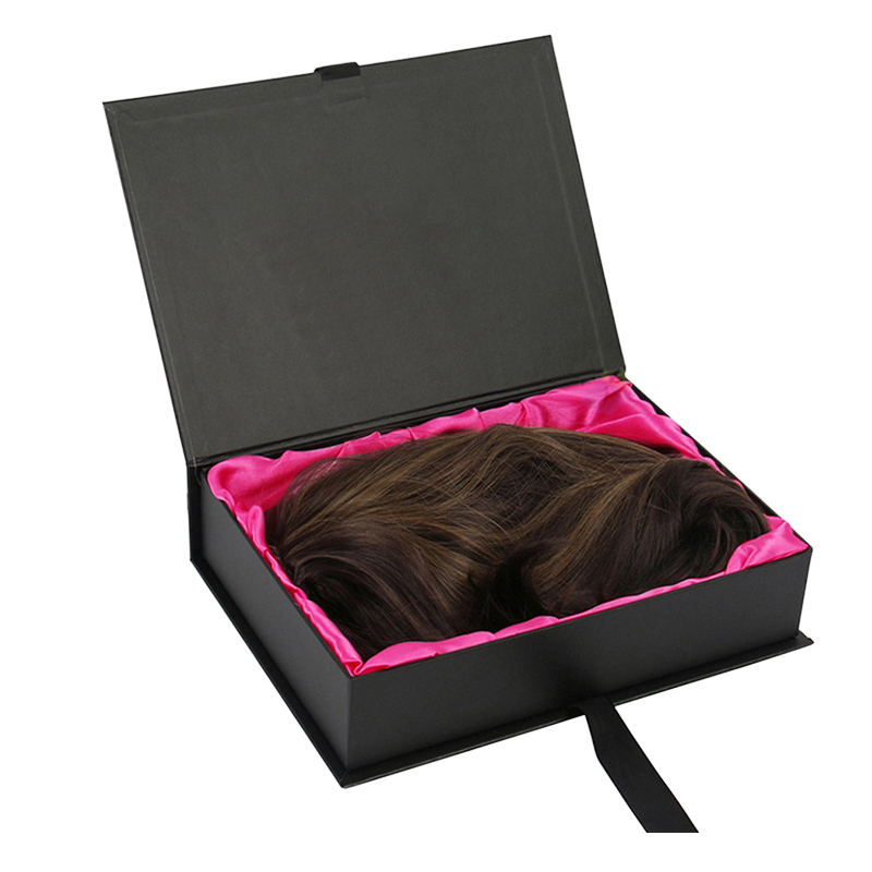 Luxury Black Kraft Wig Box with Satin Lining Custom Logo Embossed Printing Magnetic Hair Extension Packaging Glossy Lamination